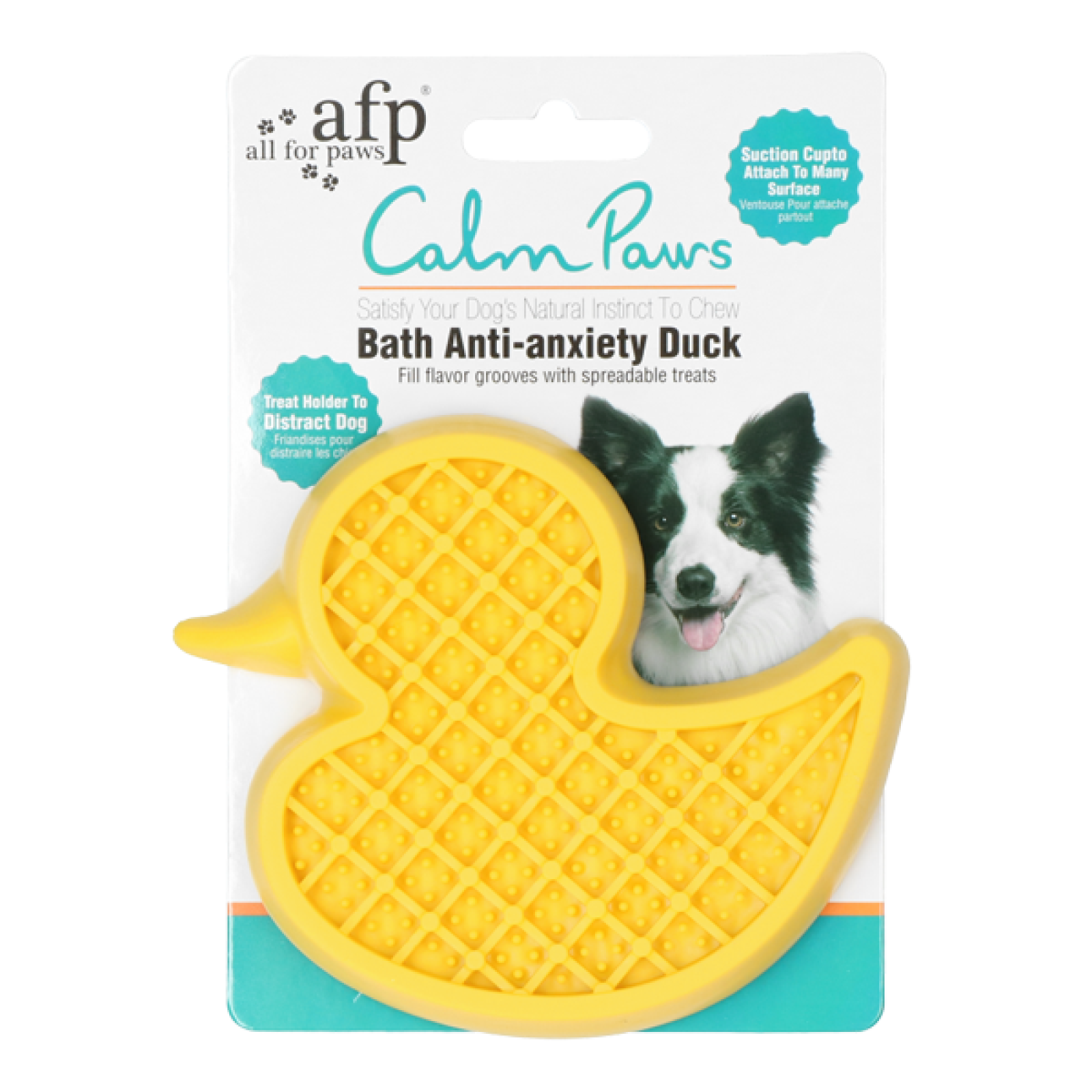 Tato "hračka" není určena pouze na koupání, ale pomůže psovi odlehčit různé stresující situace, jako je jízda autem, odchod do práce a jiné. Kachnu snadno přilepte přísavkou na hladký povrch a do silikonových prolisů vetřete třeba arašídové máslo, psí paštiku nebo jinou roztíratelnou pochoutku.
