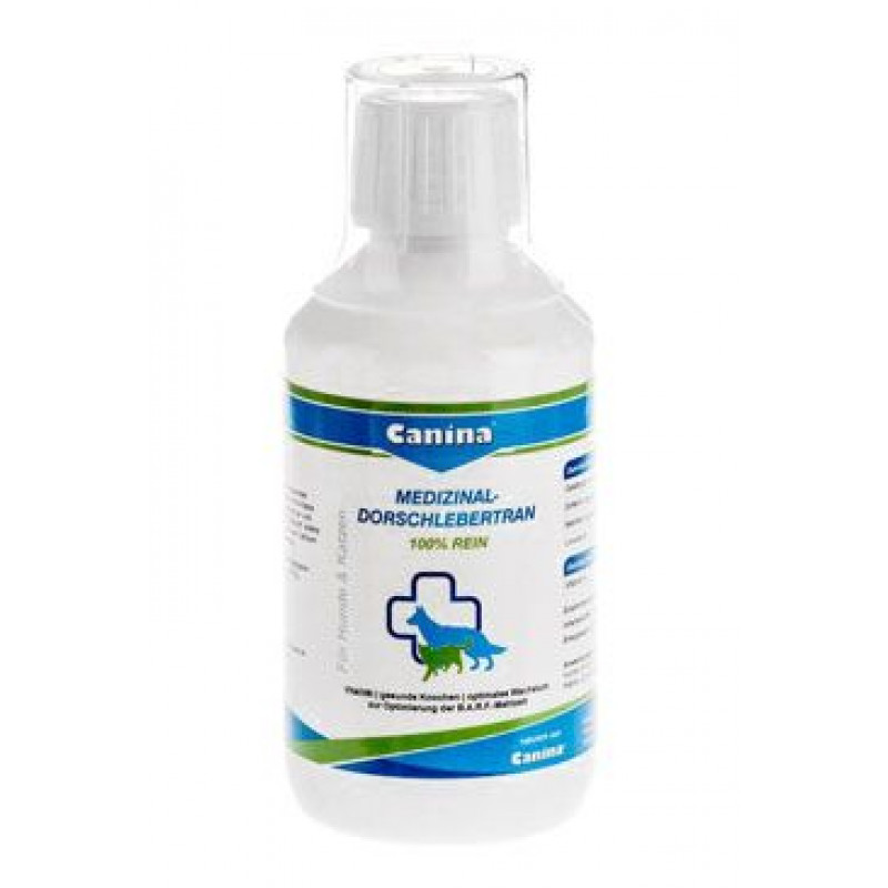 Canina Léčivý olej z tresčích jater je cenným zdrojem vitaminů s bohatým obsahem nenasycených mastných kyselin (EPA, DHA, kyseliny linolenové), které si pes ani kočka nejsou schopni vytvořit sami. Podněcuje chuť k jídlu a podporuje zdravý vývoj mláďat. Vitamin A je nezbytný pro zrak, silný imunitní systém a zdravé sliznice. Vitamin D3 podporuje vstřebávání vápníku a fosforu ve střevech, a tím pomáhá při tvorbě kostí. Pokud podáváte střídavě i BARFER'S OIL, zabráníte díky vitaminu A, E a D3 nedostatkům při krmení syrovým masem.