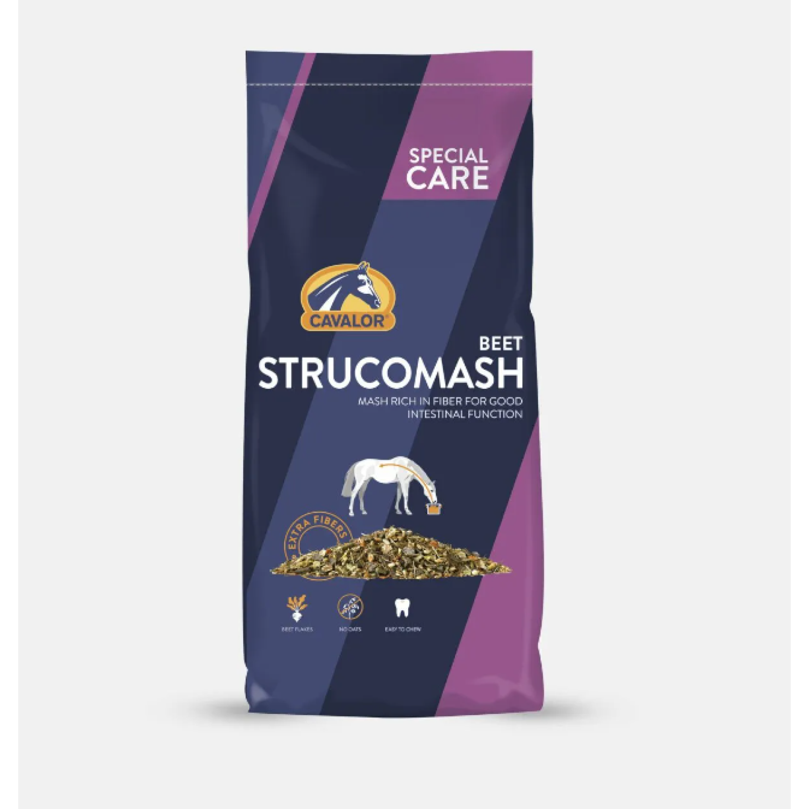 Cavalor Strucomash Beet je kaše s vysokým obsahem vlákniny pro dobrou funkci střev. Obsahuje lehce stravitelné zdroje vlákniny, jako je timotejové seno, vojtěška a 30 % vloček řepné dužiny, které příznivě působí na činnost střev. Rmut se snadno žvýká a tráví, takže je vhodný pro starší koně nebo koně se zubními problémy nebo jako hřejivá pochoutka v chladných zimních dnech.