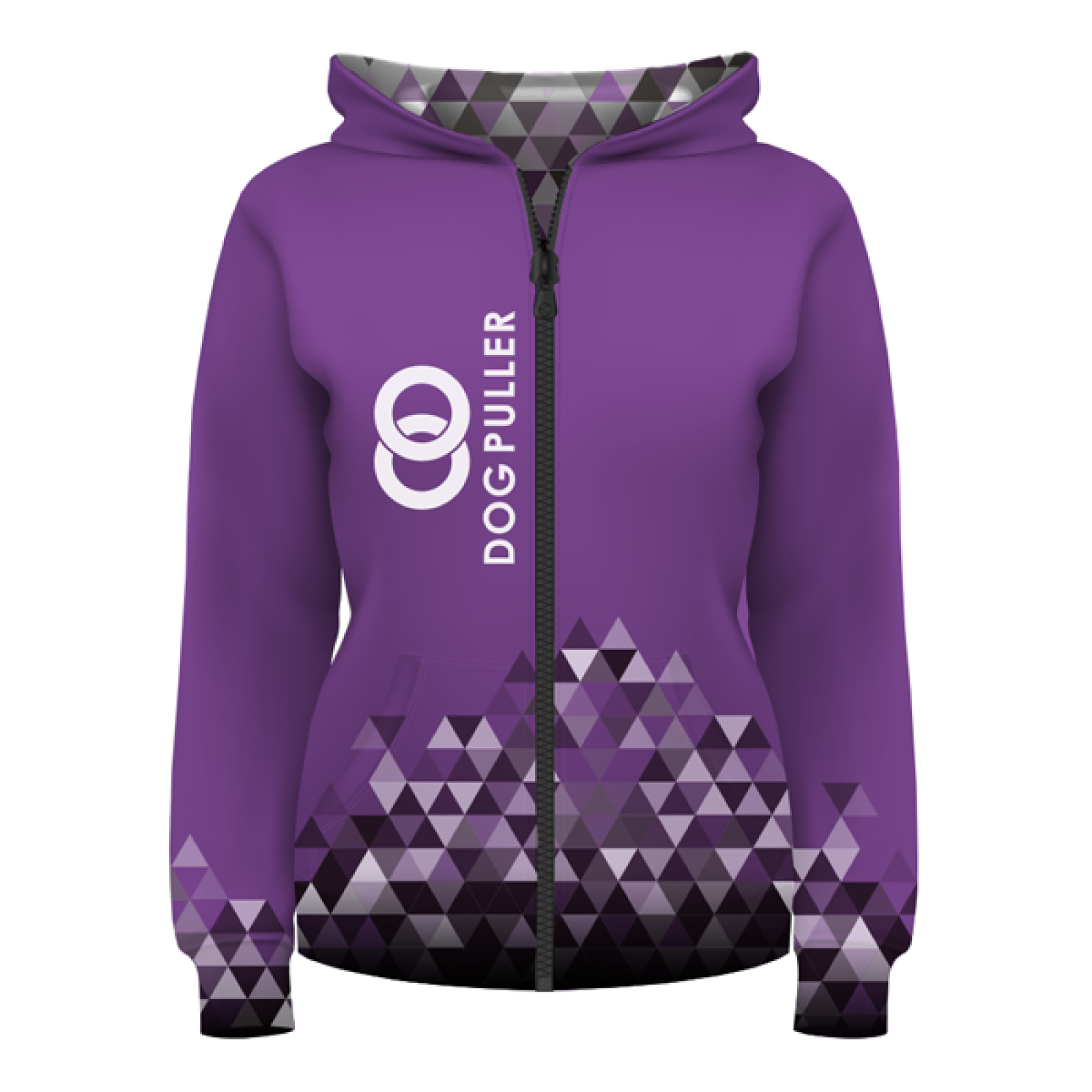 Sportovní funkční mikina ve fialové barvě s motivem Dog Puller. Mikina je celozapínací na zip, je vybavená dvojvrstvou kapucou, vnitřní strana kapucy má krásný dezén trojúhelníků a hladký povrch, takže necuchá vlasy. Pejskaři ocení praktické kapsy se skrytým zipem. Mikina Dog Puller je vyrobená z velmi přizpůsobivého pružného materiálu Shield, který je určený na výrobu elastických oděvů pro sport. Materiál mikiny má speciální povrchovou úpravu, který výrazně zvyšuje odolnost proti oděru. Záměrně jsme do střihu zakomponovali prodlouženou délkou rukávů právě pro sport Dog Puller, kde se hodně pracuje s rukama ve výšce, právě proto, aby se vám rukávy nepříjemně neshrnovali.