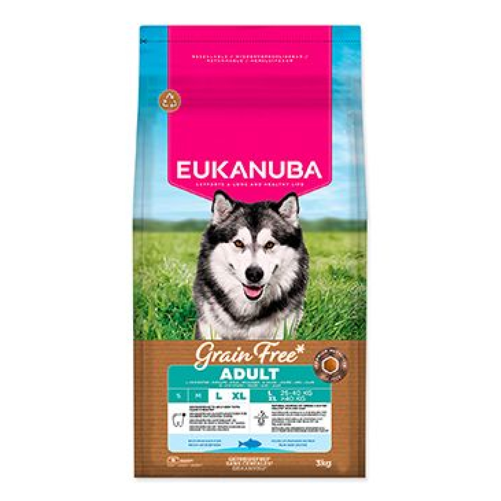 Toto suché krmivo EUKANUBA Grain Free* je speciálně vyvinuto pro dospělé psy velkých plemen od 18 měsíců do 6 let (nebo od 2 do 5 let u obřích plemen). Složení s nízkým obsahem alergenů a bohatým obsahem mořských ryb je pečlivě navrženo pro psy s citlivostí na obiloviny a podporuje jejich jedinečné nutriční potřeby. Složení bez kuřecího masa nabízí plnohodnotnou výživu s alternativními zdroji sacharidů, včetně hrachu a bezlepkových sladkých brambor*, které poskytují přírodní vlákninu, základní vitamíny a antioxidanty. Krmivo je nabité mořskými rybami a dodává vašemu psovi kvalitní živočišné bílkoviny nezbytné pro budování a udržení silných, štíhlých svalů. Pro další podporu zdravého trávení obsahuje krmivo prebiotické fruktooligosacharidy a řepnou dužinu. Přírodní zdroje omega-6 a omega-3 mastných kyselin navíc podporují zdravou kůži a lesklou srst, zatímco vápník a glukosamin udržují pevné kosti a klouby a přispívají k celkové pohyblivosti psa. Jedinečný tvar granulí v kombinaci s technologií DentaDefense pomáhá udržovat zuby čisté a zdravé. Toto 100% kompletní a vyvážené krmivo poskytuje pokročilou výživu pro dospělé psy velkých plemen, podporuje optimální tělesnou kondici, celoživotní zdraví a celkovou pohodu. Krmivo EUKANUBA poskytuje kvalitní výživu přizpůsobenou výživovým potřebám vašeho psa.