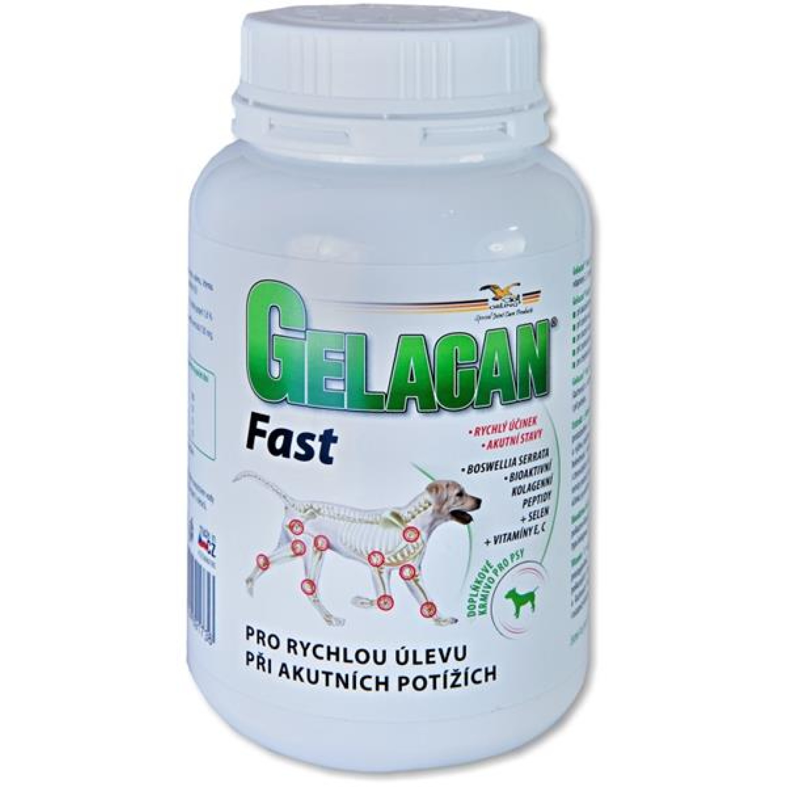 Gelacan® Fast je doplňkové krmivo s bioaktivními kolagenními peptidy, extraktem z Boswellie serraty, vitamíny E, C a selenem, vhodné k akutní aplikaci při bolestivosti pohybového aparátu psů.