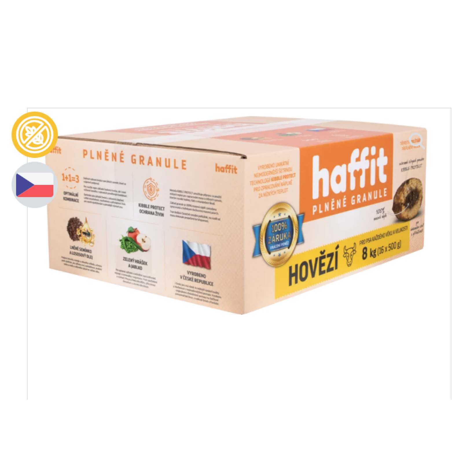 Pro plněné granule HAFFIT je typická chutnost a mimořádně vysoká využitelnost i kompletnost živin. Základem jsou vybrané kvalitní suroviny, převážně živočišné. Unikátní je zpracování technologií KIBBLE PROTECT do třívrstvého polštářku. Hlavní součást granule (66 %) je masová náplň zpracovaná za nižších teplot, aby se horkem nenarušila hodnota a využitelnost živin. Maso je ochráněno dobře propečenou křupavou vrstvou a opatřeno vrchní vrstvičkou s bylinkami. KIBBLE PROTECT – ochrana živin.