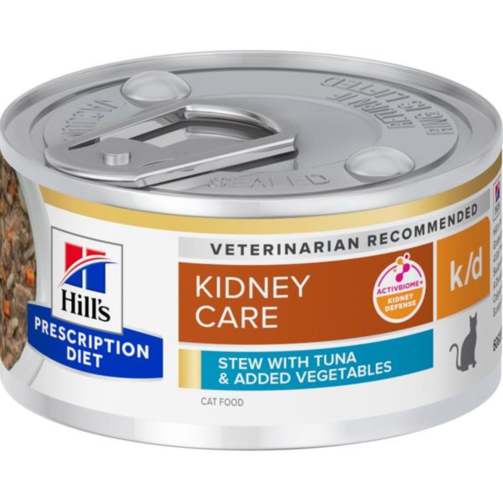 Hill''s Prescription Diet Kidney Care k/d je klinicky ověřená výživa, která pomáhá chránit životně důležité funkce ledvin kočky. Obsahuje ActivBiome+ Kidney Defense, patentově chráněnou směs prebiotik, o nichž je prokázáno, že podporují střevní mikrobiom a chrání funkci ledvin. Bylo klinicky ověřeno, že tato výživa zlepšuje kvalitu života koček a prodlužuje ho. U koček se sníženou funkcí ledvin může docházet ke ztrátě chuti k jídlu a jejich příjem potravy se může snížit. Konzerva s tuňákem a přidanou zeleninou má lákavou chuť a je sestavená tak, aby pomáhala snižovat zátěž ledvin a umožňovala jim tak účinnější fungování.