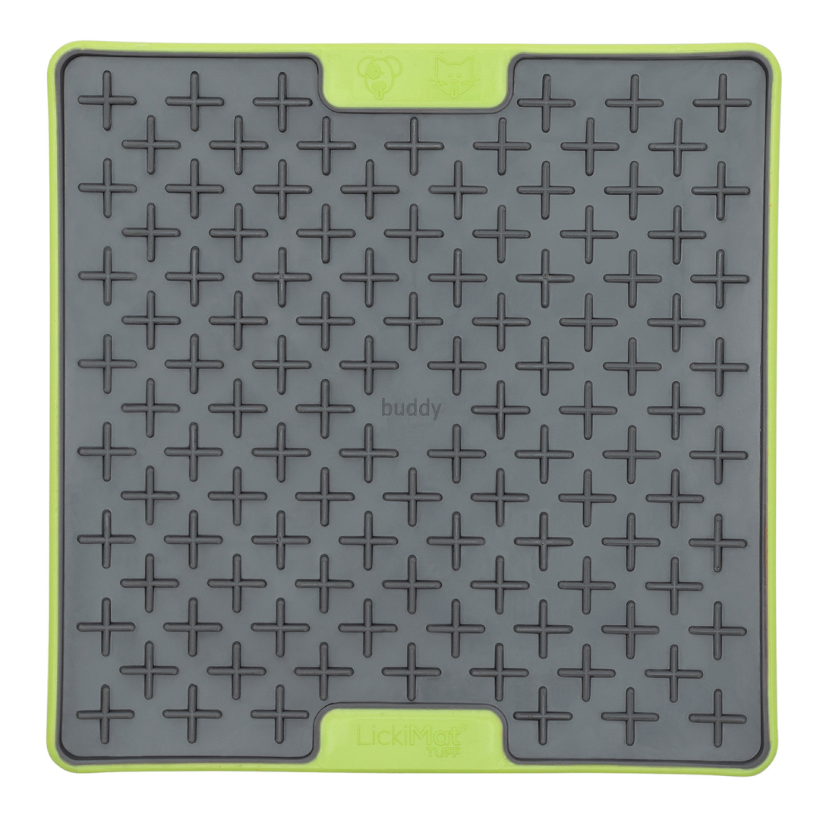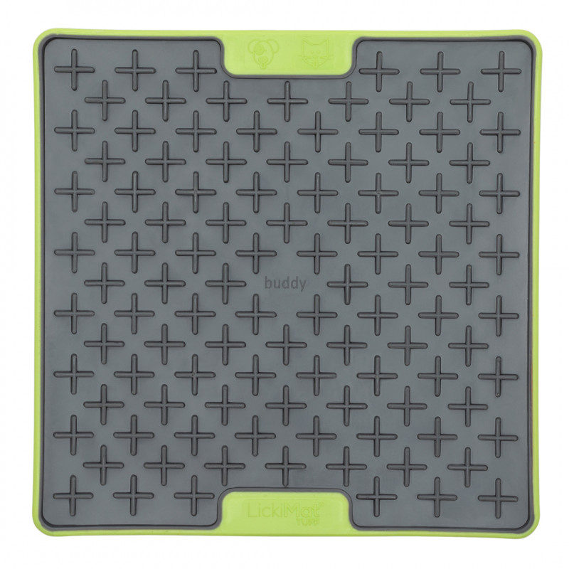 Buddy TUFF je z tvrzené přírodní gumy (kaučuku) zasazená v barevném plastovém rámečku s protiskluzovými body na spodní straně. Na rozdíl od měkkých podložek LickiMat Buddy a Buddy Large je pevná, odolá i nějakému tomu kousanci a snese mytí v myčce. Je proto vhodná pro štěňata, která ráda všechno pokouší svými zuby a pro okusovače. Není určena na žvýkání, proto ji nedovolte pejskovi okusovat, ale když se to přihodí, hned si jí nezničí.