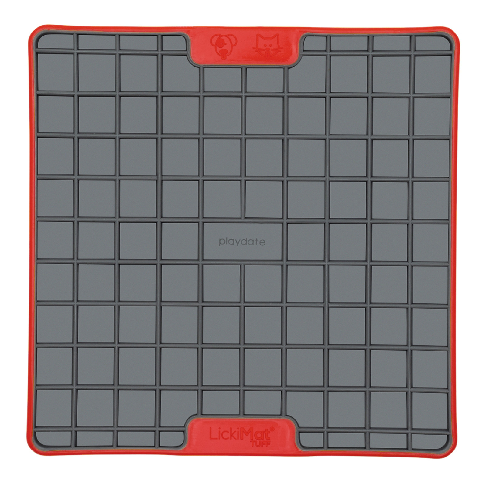 Podložka Playdate TUFF je z tvrzené přírodní gumy (kaučuku) zasazená v barevném plastovém rámečku s protiskluzovými body na spodní straně. Na rozdíl od měkkých podložek LickiMat Playdate je pevná, odolá i nějakému tomu kousanci a snese mytí v myčce. Je proto vhodná pro štěňata, která ráda všechno pokouší svými zuby a pro okusovače. Není určena na žvýkání, proto ji nedovolte pejskovi okusovat, ale když se to přihodí, hned si jí nezničí.