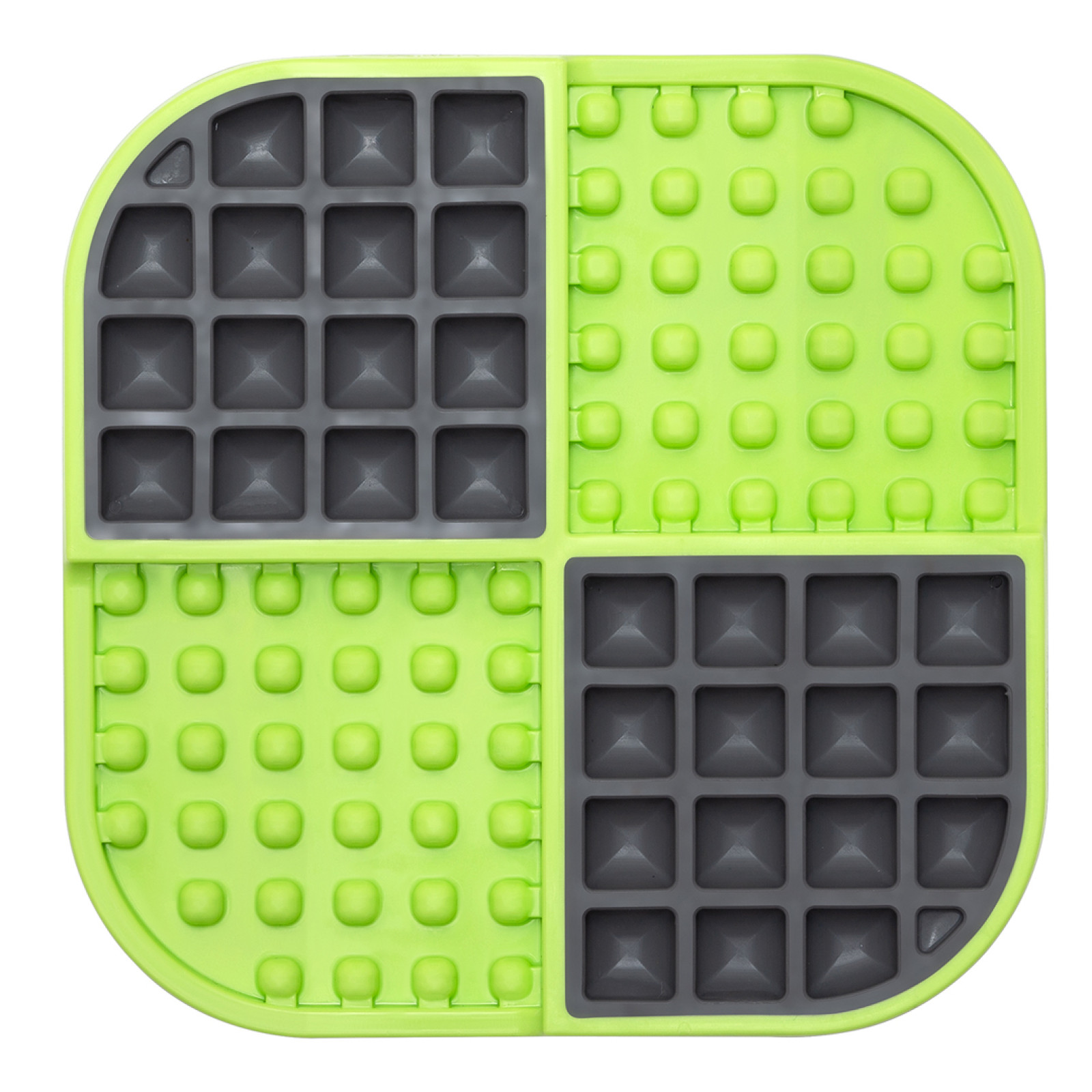 Lízací podložka Slomo je vhodná pro naplnění syrovým, mokrým, suchým a tekutým krmivem stejně jako pro jakýkoli druh mokrého mlsání, jako je např. psí arašídové máslo, rozmáčené psí sušenky, lízací pasty, jogurt apod. Jednotlivá čtvercová políčka dovolují podávat krmiva různé konzistence odděleně, jsou ideální pro zpomalení jedení větších kousků nebo granulí. Do výstupků v barevné části zase jednoduše vetřete krémové dobroty nebo nalijete tekuté mňamky.