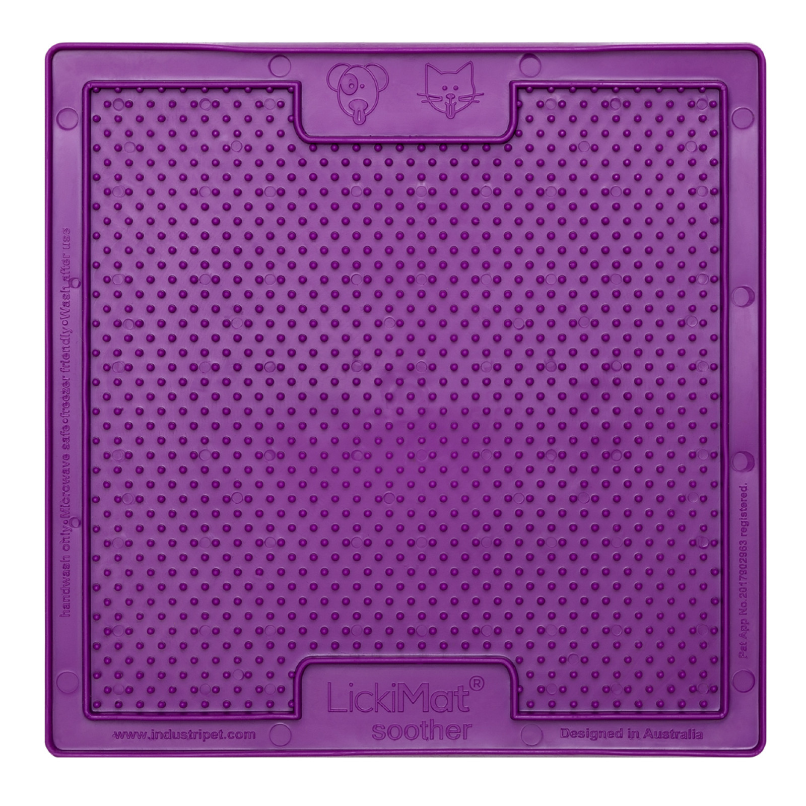 Lízací podložka Soother je nejnáročnější svým povrchem a je vhodná pro naplnění tekutým krmivem nebo pro jemné mokré mlsání, jako je např. psí arašídové máslo, lízací pasty, jemná paštika, jogurt apod.