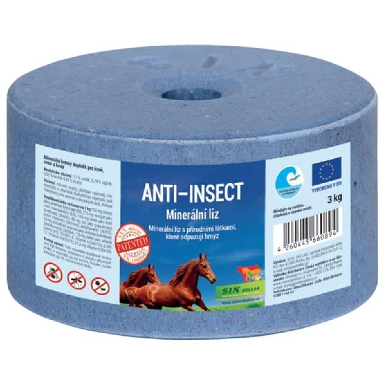 Anti Insect, minerální liz s přírodními látkami, které odpuzují hmyz pro koně, skot a kozy.