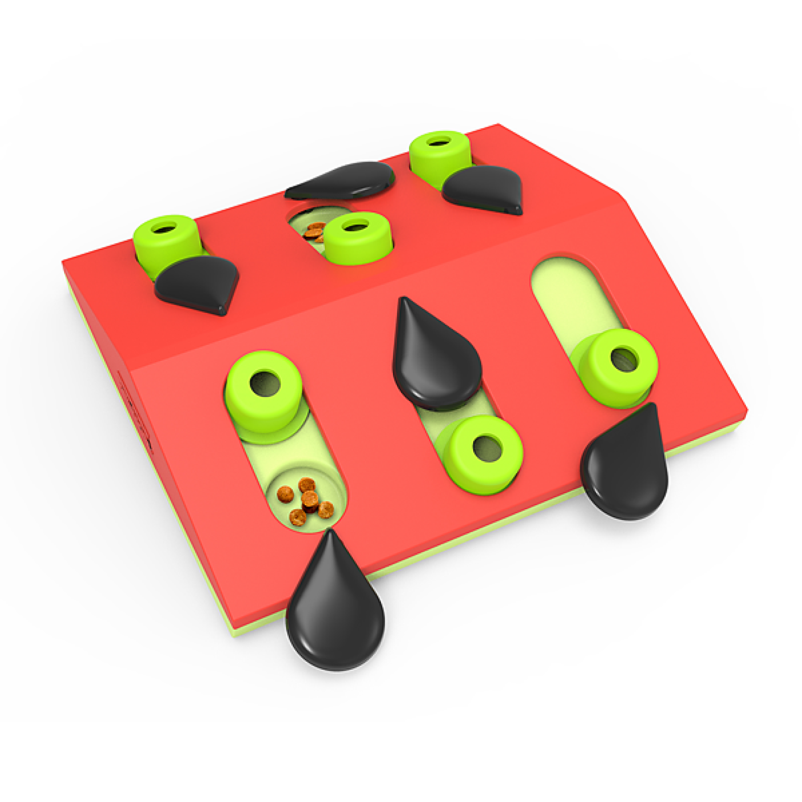 Ukryjte pamlsky nebo oblíbené granulky pod melounová semínka nebo pod zelené kolíčky (pamlsek vhoďte dovnitř ovorem) a připravte své kočce dlouhotrvající zábavu. Pamlsky lze jednoduše získat posunutím černého semínka, složitější hru pak nabízí zelené kolíčky, které je třeba posunout na místo odklopeného semínka, pamlsek se dostane do prohlubně. Když kočka odsune kolíček drážkou zpět, získá svou mlsnou odměnu.