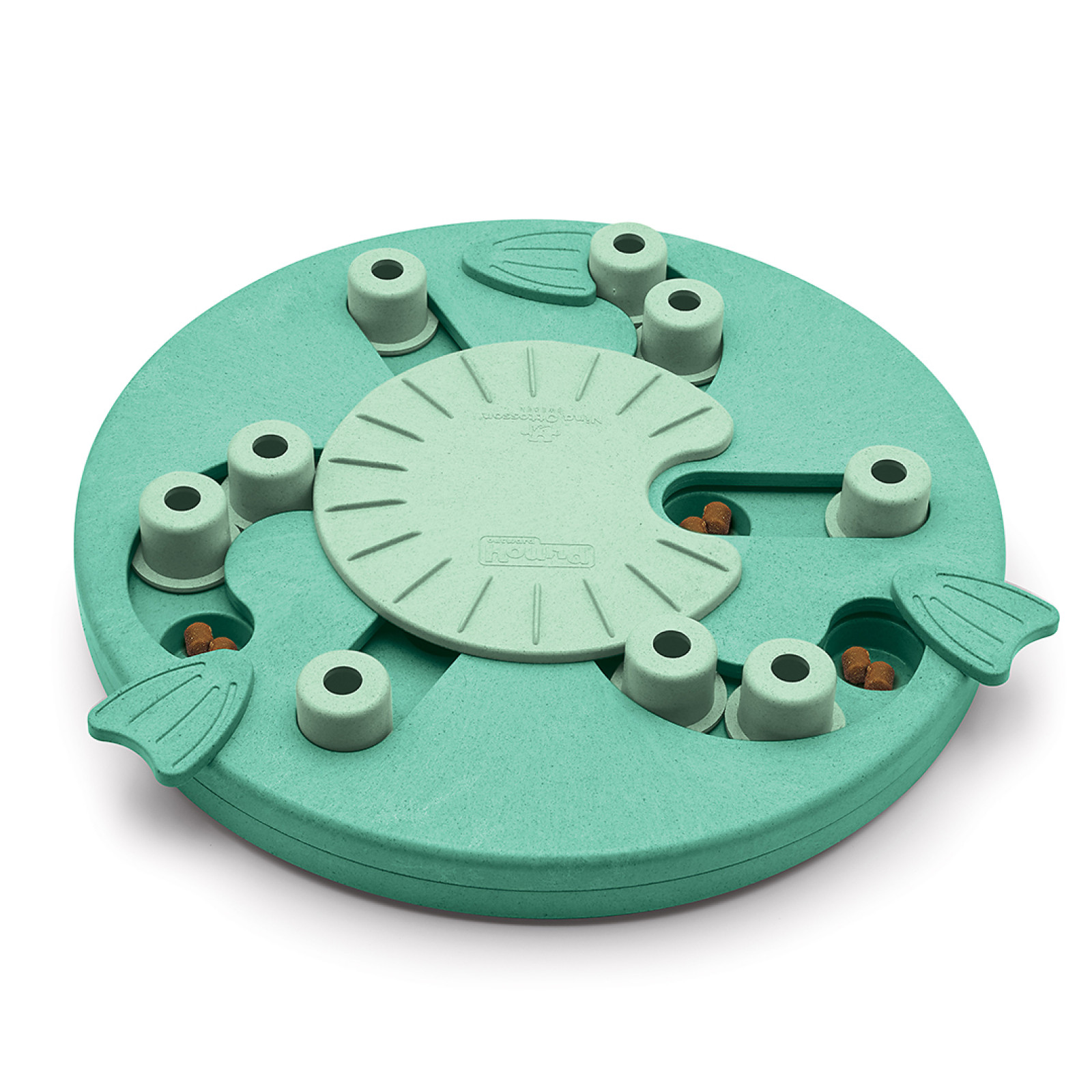 - Pamlsky vložte do větších kruhových prohlubní v hlavolamu a také do dotvorů v posuvných kolících. Pamlsky překryjte otočnými destičkami nebo posuvnými kolíky a hra může začít!