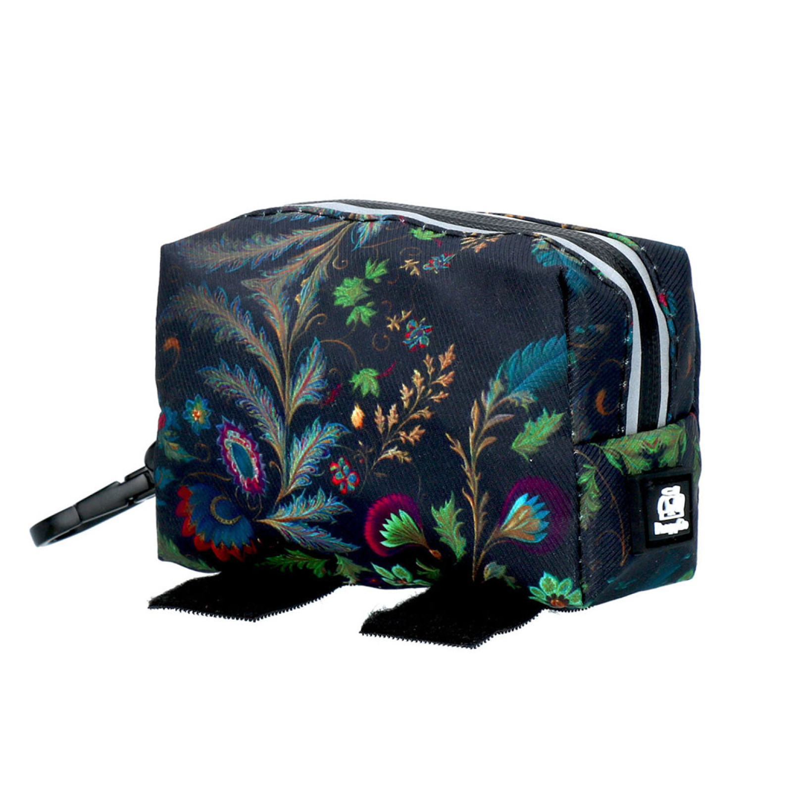 Taška má protahovací otvor z gumy, díky němuž vytahujete sáčky pohodlně a snadno je odtrhnete. Je vybavená kovovou karabinkou, ze spodní strany jsou dvě poutka ze suchých zipů. Otevírá se na zip, který je všitý do celé poloviny taštičky, takže je při otevření velmi prostorná a přehledná. Kolem zipu má reflexní proužky, které zvýší vaší viditelnost ve tmě.