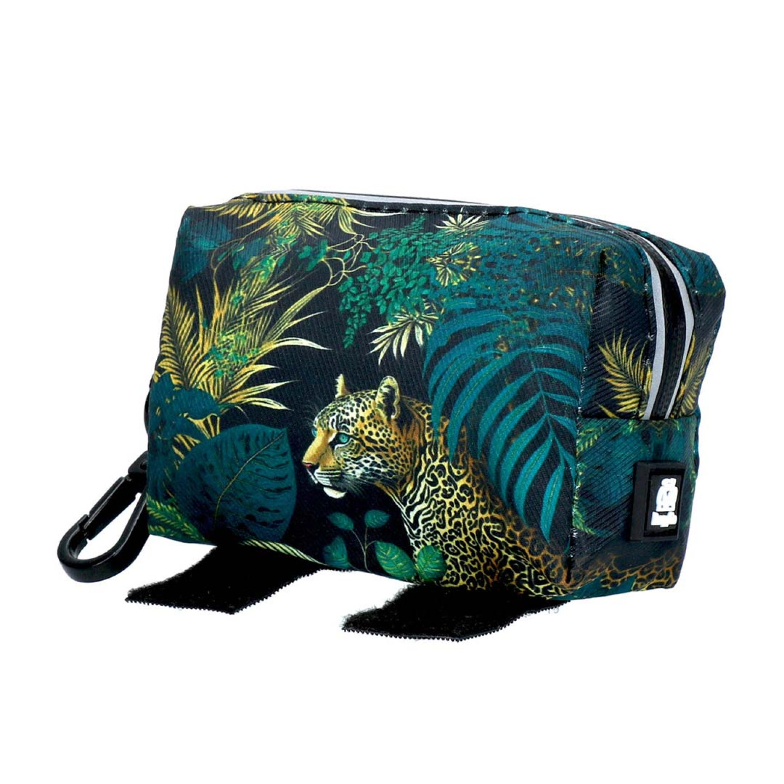 PoopyGo moderní taštička na drobnosti s otvorem na bobkosáčky s obrázkem jaguára na elegantním černém podkladu.