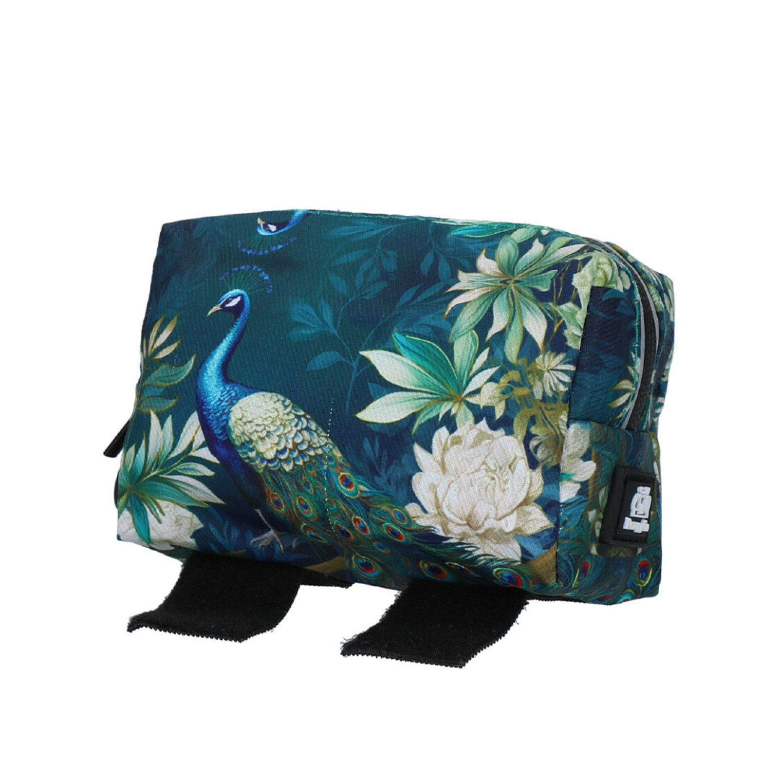 PoopyGo moderní taštička na drobnosti s otvorem na bobkosáčky s pávem v zelenomodré elegantní kompozici.