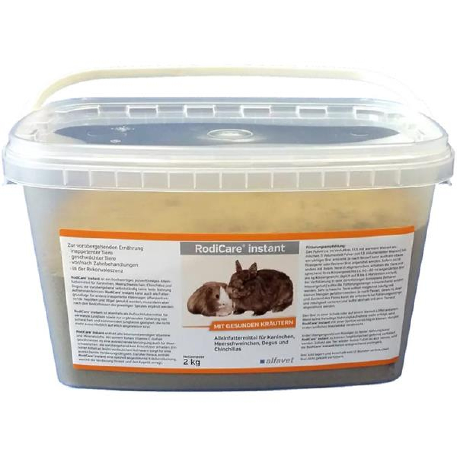 RodiCare Instant je hodnotné kompletní krmivo v práškové formě, určené pro zakrslé králíky, morčata, osmáky a činčily, kteří přechodně nemohou přijímat pevnou stravu. Se zdravými bylinkami.
