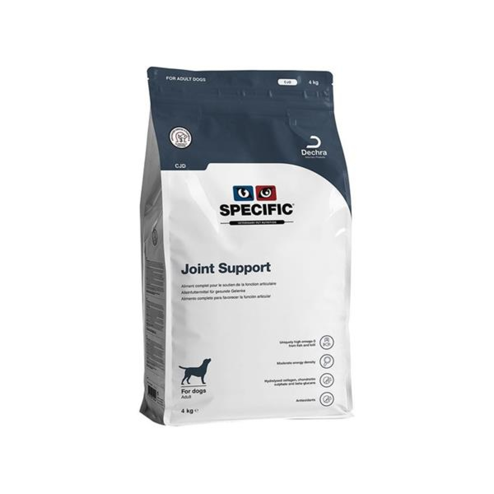 Granule SPECIFIC CJD Joint Support obsahují unikátně vysokou hladinu omega-3 mastných kyselin EPA a DHA a omega-6 mastné kyseliny GLA, které podporují zdravou funkci a hybnost kloubů díky podpoře přirozených protizánětlivých procesů. Omega-3 mastné kyseliny jsou získávány z rybího tuku a mají okamžitý příznivý účinek. Kompletní a vyvážená dieta s nízkým obsahem energie usnadňuje udržení optimální tělesné hmotnosti a tím i zdraví kloubů. Obsažený L-karnitin stimuluje spalování tuků a uchování svalové hmoty. Krmivo obsahuje hydrolyzovaný kolagen, ß-1,3/1,6-glukany a chondroitin, které podporují zdraví kloubů a přispívají ke snížení aktivity enzymů, jež poškozují chrupavku. Vysoký obsah antioxidantů neutralizuje volné radikály v kloubech. Správnou funkci kloubů podporuje také vysoký obsah manganu, který je kofaktorem syntézy proteoglykanů.