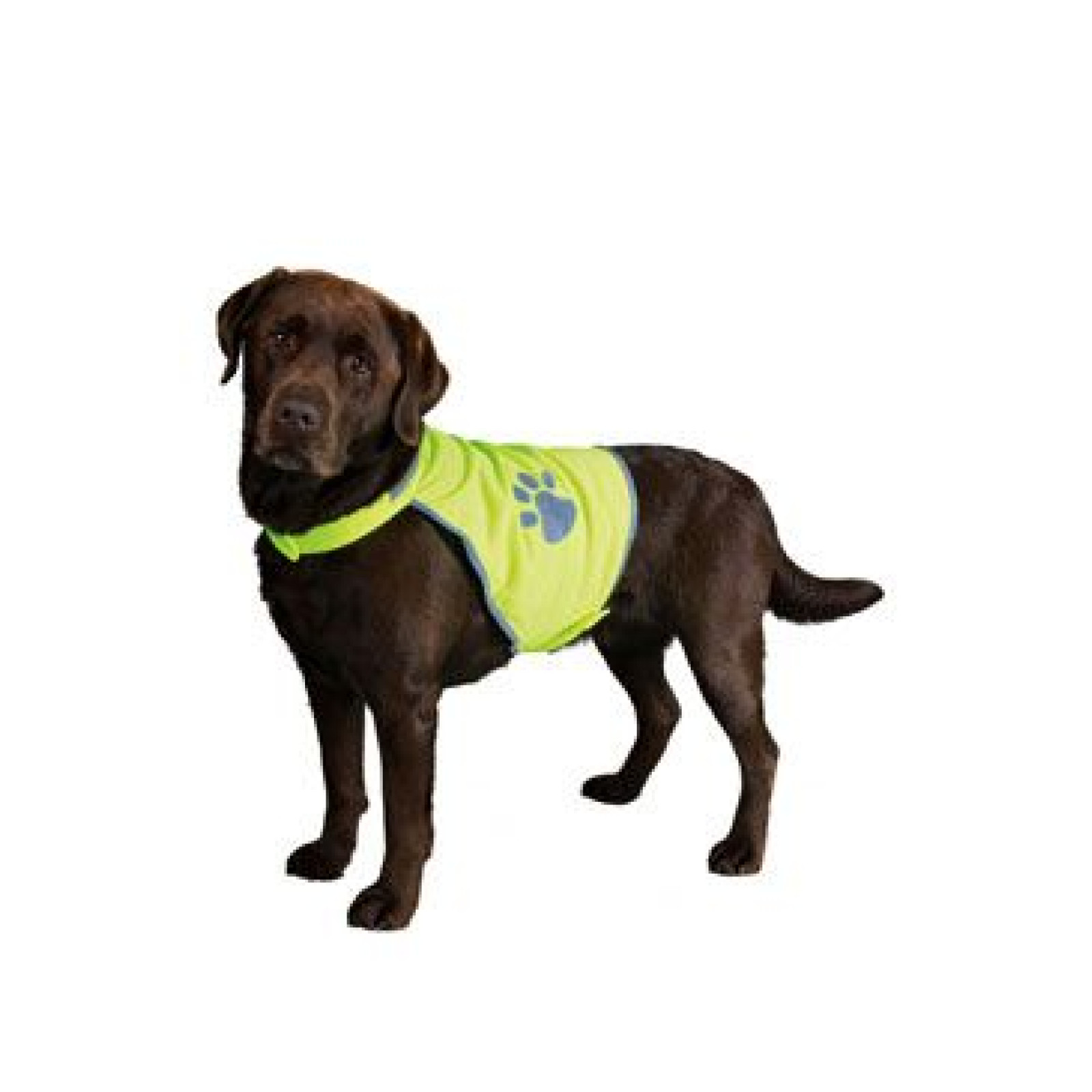 Vesta je neonově žlutá a má ještě reflexní okraje a tlapku. Použití reflexní vesty při venčení výrazně zvyšuje bezpečnost vašeho pejska.