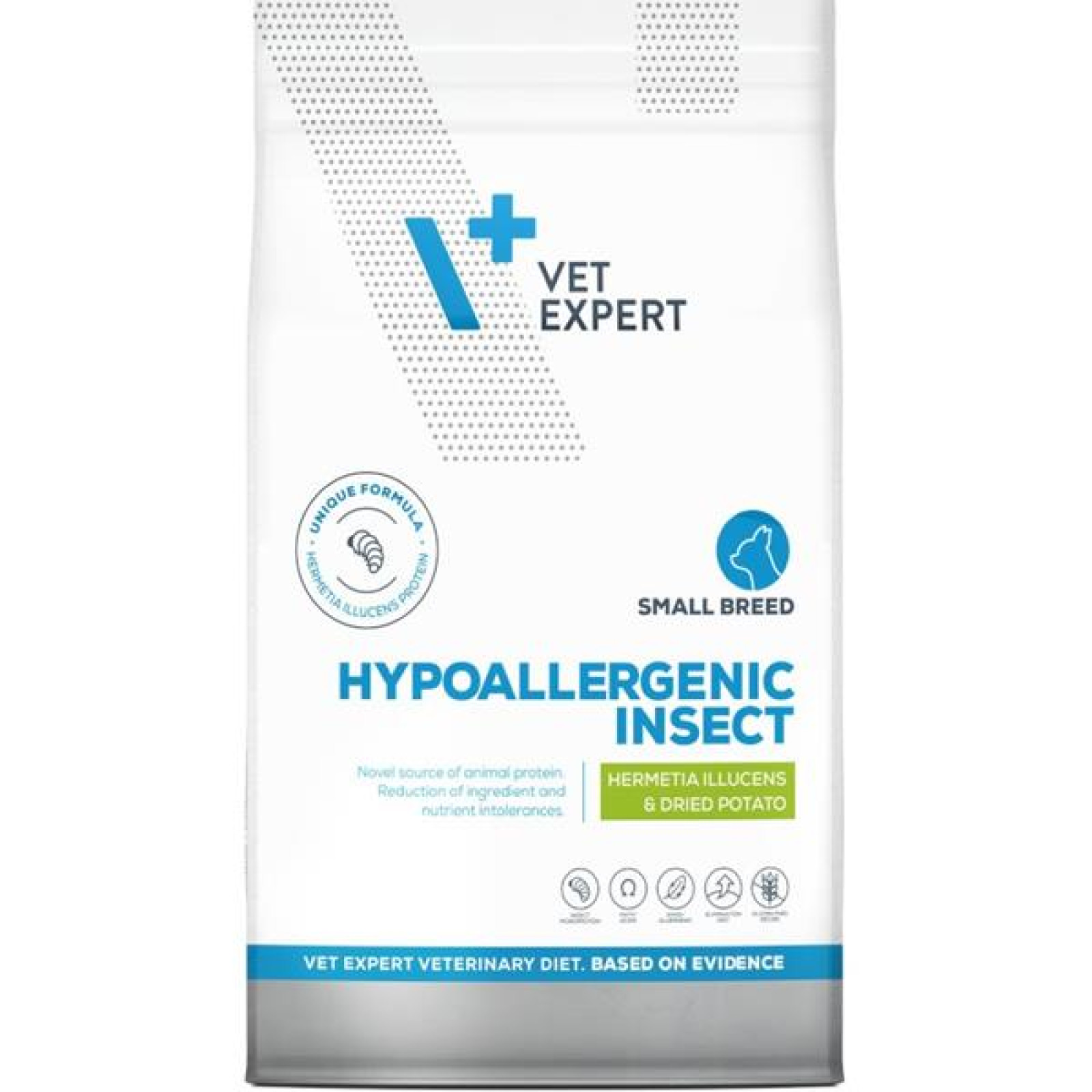 VetExpert Hypoallergenic Insect Small Breed je kompletní dietní krmivo pro dospělé psy malých plemen, určené ke zmírnění potravinových nesnášenlivostí a k podpoře funkce kůže při dermatóze a nadměrné ztrátě srsti.
