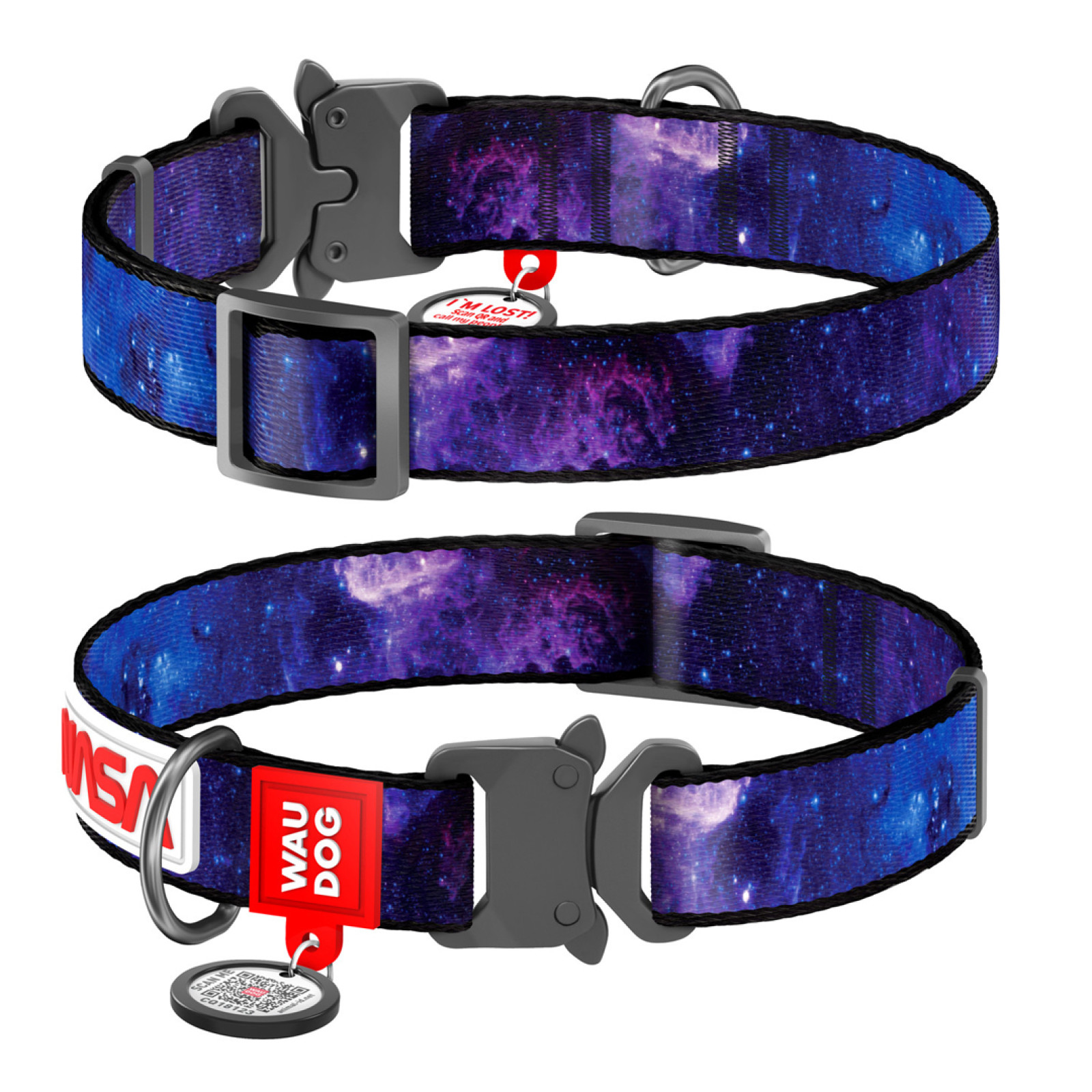 Vzor NASA21 je noční obloha plná hvězd. Titanová spona Fastex a QR chytrá známka dělá z tohoto obojku hvězdu naší kolekce Waudog.